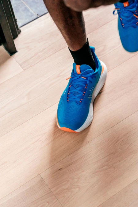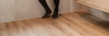 V budoucnu by si rád tady v prvním patře zřídil tělocvičnu. Ne kvůli posilování – na trénink chodí do nedaleké posilovny – ale kvůli celkové stabilizaci kondice. Ačkoliv parquetvinyl snese i pořádný náraz, jak se mohl Bašír přesvědčit na vlastní kůži v showroomu Lamett. „Chtěli po mně, abych na podlahu pouštěl závaží. Nejdřív jsem byl opatrný. Ty lamely mají tloušťku 5 až 7,5 milimetru, takže očekáváte, že se zlomí. Ale to se nestalo, takže pak jsem do toho šel opravdu po hlavě," směje se a předvádí, jak mlátí imaginárními závažími o zem. Pod vrchní vrstvou této lamely je přece jen tvrdé jádro, vyrobené ze směsi vápence a PVC. Pod ním je integrovaná podložka, která pohlcuje drobé nerovnosti při pokládce, ale má také tlumicí účinek: není to zbytečný luxus. Díky tomu Vás nebude nic budit ze spaní.
