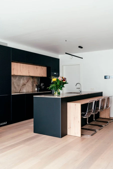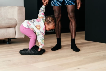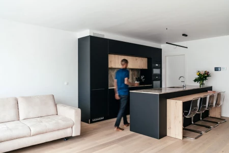 Celá rodina miluje obytný prostor, a zejména podlahu. „Vyzařuje teplo a je měkká, a přitom neklouže,“ říká Bašír. Manželé si vybrali dřevěnou podlahu z kolekce New York v decentní barvě Pure Plus, která jim následně posloužila jako univerzální základ pro výběr zbytku interiéru. Například černou kuchyňskou linku, kterou si vybrali později, zvolili tak, aby odpovídala barvě a struktuře podlahy. „Nepotřebujeme mít spoustu věcí,“ říká Nimo. „Je to tu záměrně jednoduché. I když nábytku bude víc. protože jsme se právě nastěhovali. Ale díky podlaze bude všechno působit harmonicky."